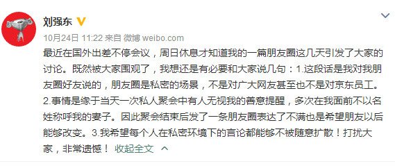 24日,刘强东在微博解释称,当时那条朋友圈并非针对广大网友,