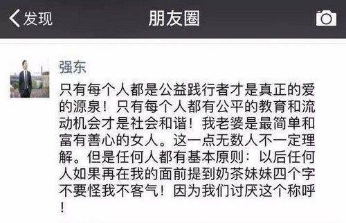 事情是这样的,昨日晚间,刘强东在其朋友圈转发了一条章泽天做公益的新闻,并附言说道:“只有每个人都是公益践行者才是真正的爱的源泉!只有每个人都有公平的教育和流动机会才是社会和谐!我老婆是最简单和富有善心的女人。这一点无数人不一定理解。但是任何人都有基本原则:以后任何人如果再在我的面前提到奶茶妹妹四个字不要怪我不客气!因为我们讨厌这个称呼!”