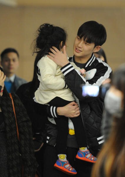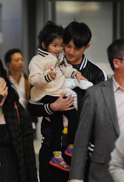 今日阿拉蕾在妈妈的陪同下抵达上海,一出机场董力便为其送上玩具和糖果并一把抱起阿拉蕾,