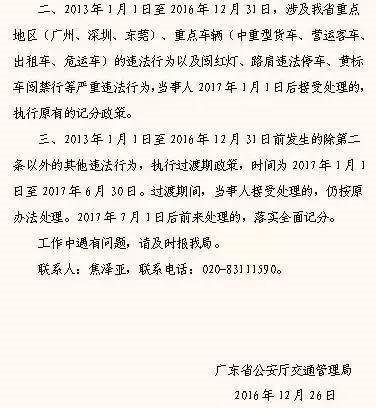 通知的第二条也很重要。2013年1月1日至2016年12月31日期间发生的“三重”违法(重点地区:广州、深圳、东莞,重点车辆:中重型货车、营运客车、出租车、危运车,严重违法:冲红灯、路肩违法停车、黄标车冲禁行等)一律严格执行记分政策。这意味着,只要属于这些类型的交通违法行为,不管什么时候处理,都将按照相关规定实行记分政策。