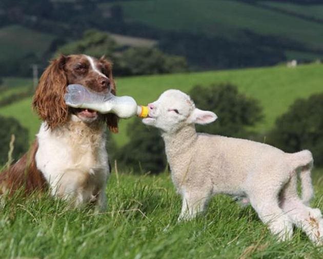 在我们的身边,有许多感动人心的故事发生,图为狗狗给小羊羔喂奶的照片,体现了动物之间的冷暖