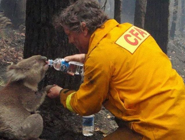 2009 年澳洲一场大火上,消防员正给予一只树袋熊水喝