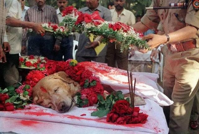 图中的狗狗为Zanjeer,他在过去曾在多次检测中找出3329公斤炸药、600 枚雷管,249 枚手榴弹,6406发实弹,拯救成千上万人的生命,并于2000年死后获得风格大葬
