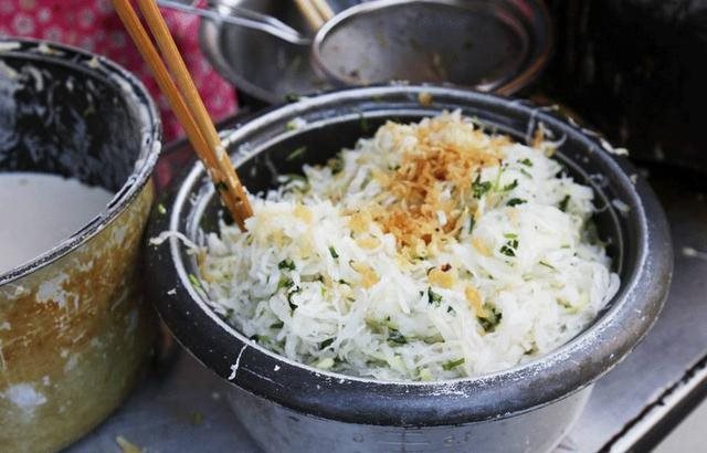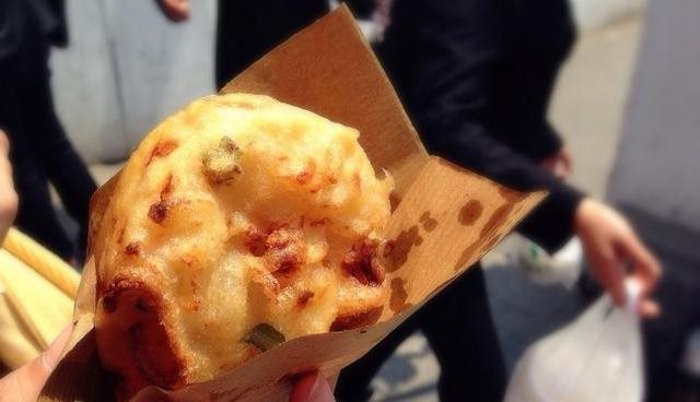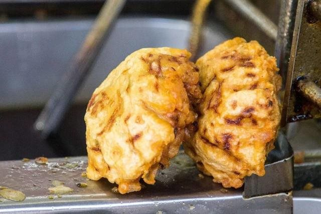 2.虽然只是街边小吃,但油墩子的制作也颇为考究。支一口并不很深的油锅,将少许调稀的面糊倒入铁勺中,并加入葱花、萝卜丝与河虾,再复以面糊入油锅炸。略带咸味的面糊加上提鲜的萝卜丝、葱花以及整只的鲜虾,使得油墩子的口感十分具有层次感,由于价廉物美,而广受人们的青睐。