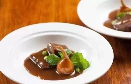 3、放入芡菰,小火烧至芡菰软糯,大火收汁,将小牛肉,芡菰装盘,淋入原汁,点缀熟蜜豆粒、薄荷叶即可
