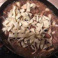 12. 先加入生抽、黄冰糖后,加入啤酒,再加入泡发香菇剩下的香菇水。然后加入一汤匙老抽,搅动均匀