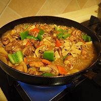 13. 鸡块入锅炖煮10分钟后,香菇与土豆、喜欢吃豆腐皮的朋友可以把豆腐皮一起放入锅中