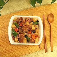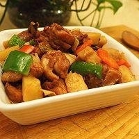 14. 加盖继续焖煮10分钟。见鸡块成熟,土豆拿筷子一插即软,豆皮上色入味后,加入青红椒,开盖大火收汁。等汤汁变的稠一些,关火盛出。