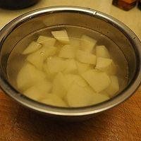 3. 土豆去皮切小块,拿清水浸泡防止氧化,同时能去除多余淀粉。