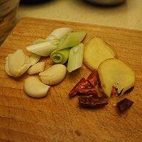 6. 大葱切段、大蒜拍扁、姜切片,干辣椒切段
