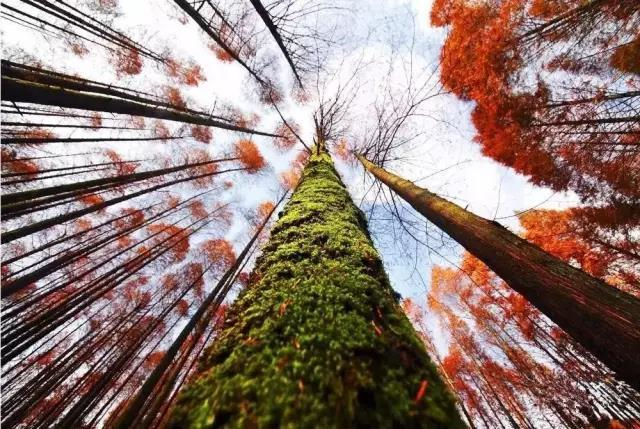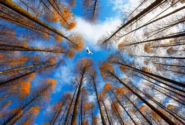 在林间抬头而望,总会看到意外的风景,蓝天白云下,笔直的树干和斑斓的红叶尤为夺目!随手一拍,都是浑然天成的明信片!