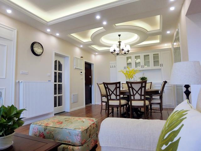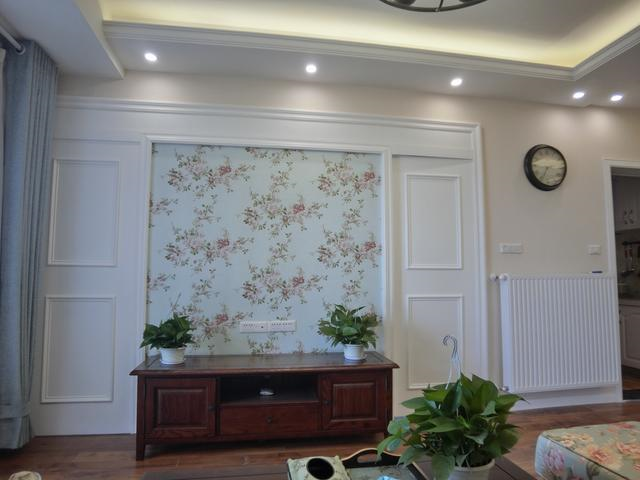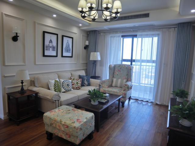客厅美式最经典的小碎花当然不能少了,背景墙用石膏线条和挂画做装饰。窗帘为了实用好看,特意增加了一层窗帘纱。