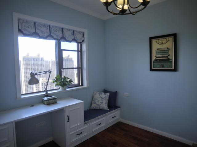 次卧浅蓝色设计,窗边打了一排多功能组合柜,效果很满意哦,喜欢的朋友可以借鉴。