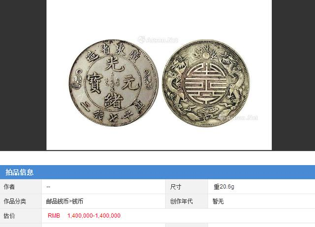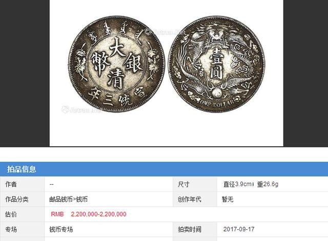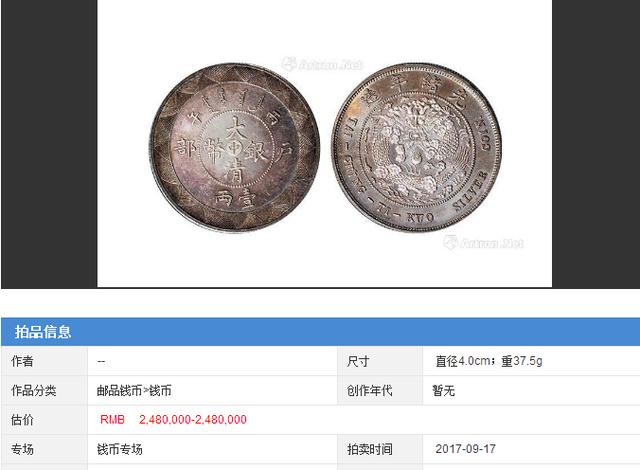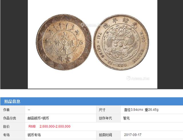 清代末朝因币制紊乱,朝廷亟思改革,光绪三十二年于天津户部造币总厂试制计重银币,见有壹两、伍钱、贰钱及壹钱四种,正面中央阴文“中”字,外围钤“大清银币”、珠圈外上钤满文,下钤币值“壹两”,左右分钤“户部”、“丙午”;背面中间蟠龙图,外围钤“光绪年造”及英文(译为“大清帝国银币”),仅试铸未发行,存世为数甚少送拍(kong_luit)