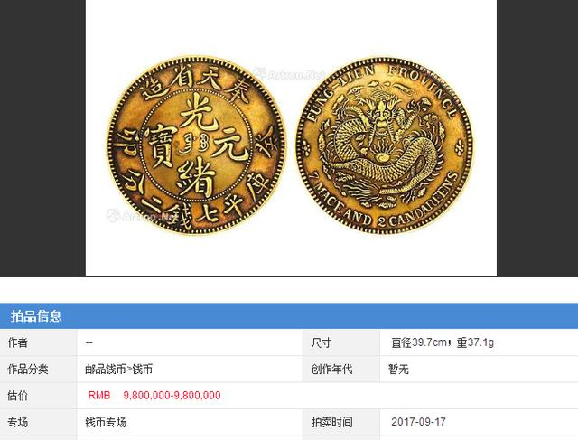 此币于光绪二十九年奉天省(今辽宁)造币厂铸造,直径3.9厘米。正面上方为“奉天省造”,中间为“光绪元宝”;背面为蟠龙图案,四周环绕英文“奉天省·库平一两”。其试铸后未发行,极珍罕。