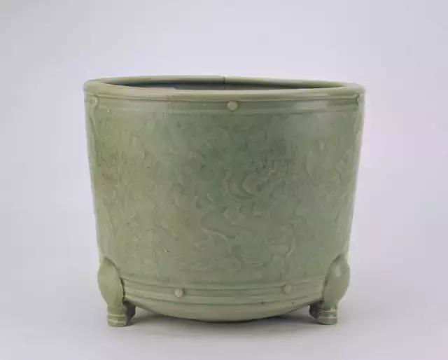 元代龙泉窑香炉出现了一种新的形制,它在原有三足炉的基础上,在器物底部多加一层而略高于三足。我院收藏的明代龙泉炉大多继承元代香炉特征,多为悬足炉造型,纹饰绘有云龙、八卦、缠枝莲等。此炉胎体厚重,釉层略厚,透明度较高,纹饰刻划简略,为明龙泉窑典型器物。