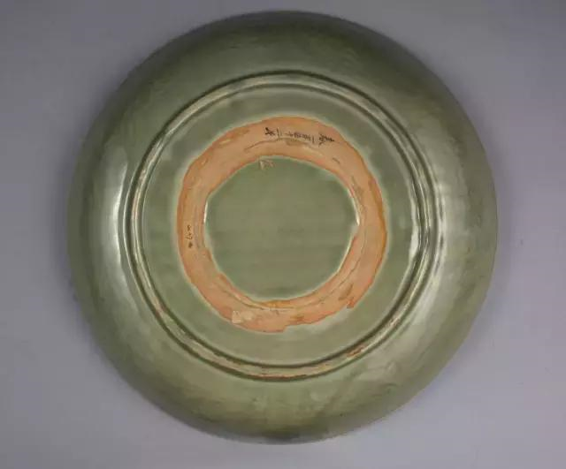盘敞口,浅腹,坦底,圈足。里外施青釉,底部无釉,露胎处呈火石红色。盘心模印云龙纹,内壁刻划花纹。此盘器形较大,胎体厚重,釉呈青黄色,在较厚的釉层下模印的云龙纹清晰可见,据此表明这是元代龙泉窑青瓷的典型器。