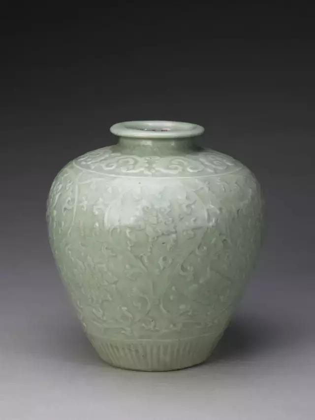 龙泉窑青瓷自宋代发展到元代虽然烧造地区扩大且产量巨增,但已无法烧出南宋时期的梅子青色。为弥补青瓷呈色的不足,元代龙泉窑青瓷常采用模印、贴塑、镂雕等工艺手段作装饰,以追求图案美和造型美。