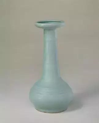 净瓶直口,长颈,丰肩,肩以下渐收敛,近足处微外撇,圈足。颈下部有轮状出沿。内外施粉青色釉,釉面匀净。