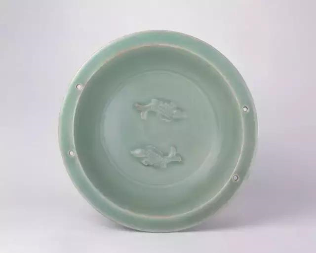 此洗敞口,折沿,圈足。洗心内塑贴两条游鱼,外壁刻凸菊瓣纹一周。口沿两侧各有两个穿孔,相互对应,可用于穿饰金属提环,以便于提携。此器釉色青翠,塑贴鱼纹清晰,是南宋龙泉窑的典型作品。在韩国新安海底沉船中亦发现有类似器物。