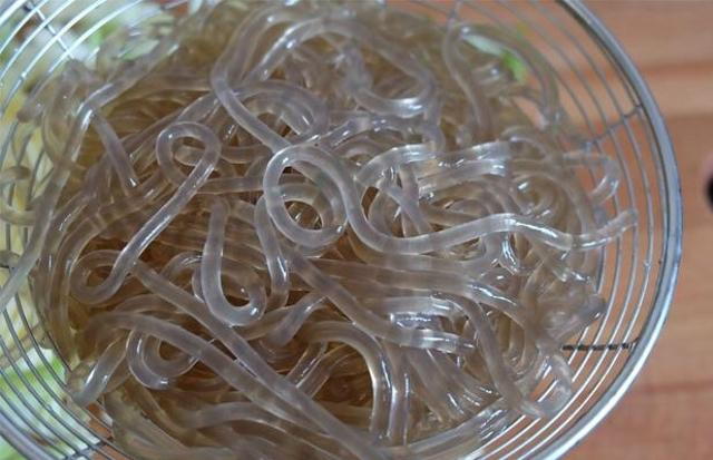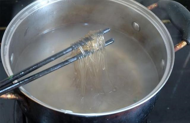 2、将红薯粉条洗净后倒入开水锅里煮软,没有硬芯就可以了。