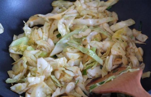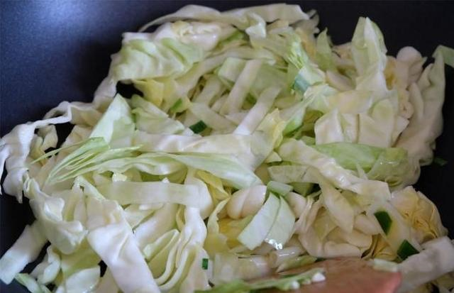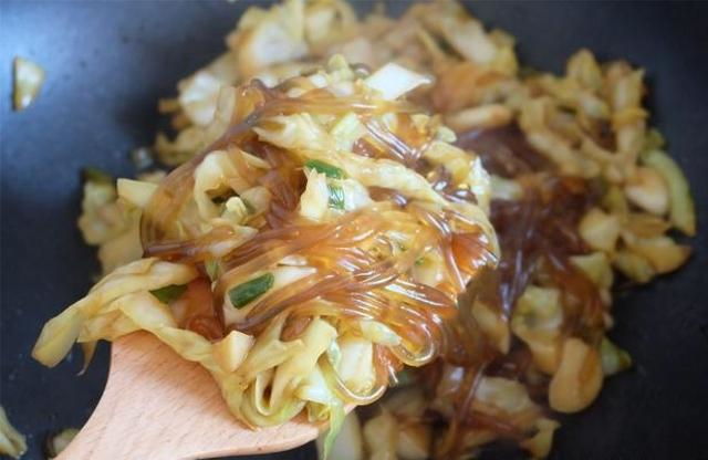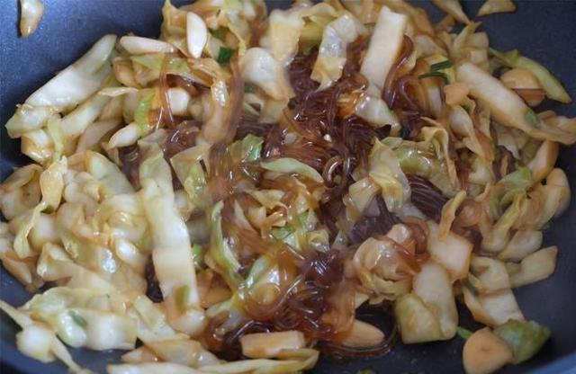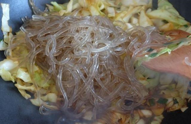 8、把前面煮好的红薯粉放入,翻炒,圆白菜本身会出水,正好红薯粉条也能吸收一点水份,让二者水份综合。