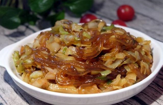 9、 粉条吸收了圆白菜的汤汁,颜色会变得晶莹剔透,在圆白菜还有些脆嫩的口感,加入盐调味就做好了。