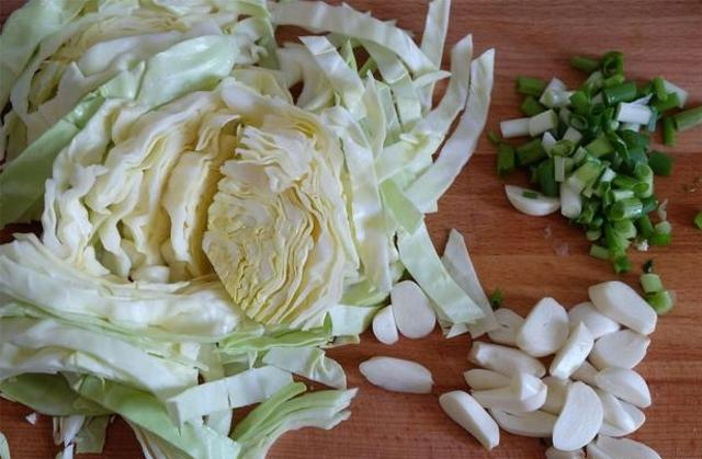 4、圆白菜切成小段或者小条状,香葱切碎,大蒜切成片。