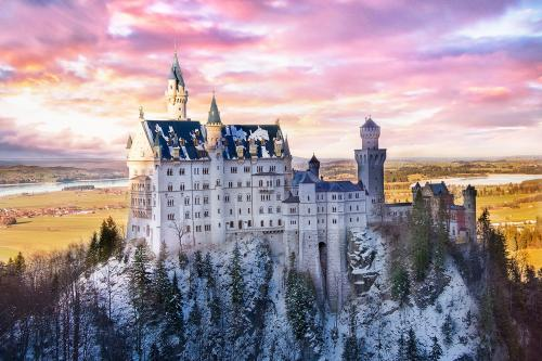19世纪在德国高山上旧天鹅堡遗址上修建,四季都有不同的风光。巴伐利亚国王路德维格二世为了满足对瓦格纳剧本的幻想而修建,耗费巨资,路德维格耗光财产并借了外债才修成,结果城堡还没完全建好他就死了,他在城堡里只住过11个晚上。这个城堡也是迪士尼睡美人城堡的原型。