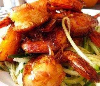 4、待汁快收干撒入葱,炒匀出锅;5.黄瓜切丝,虾倒在上面就可以喽~超级简单又好吃呢。
