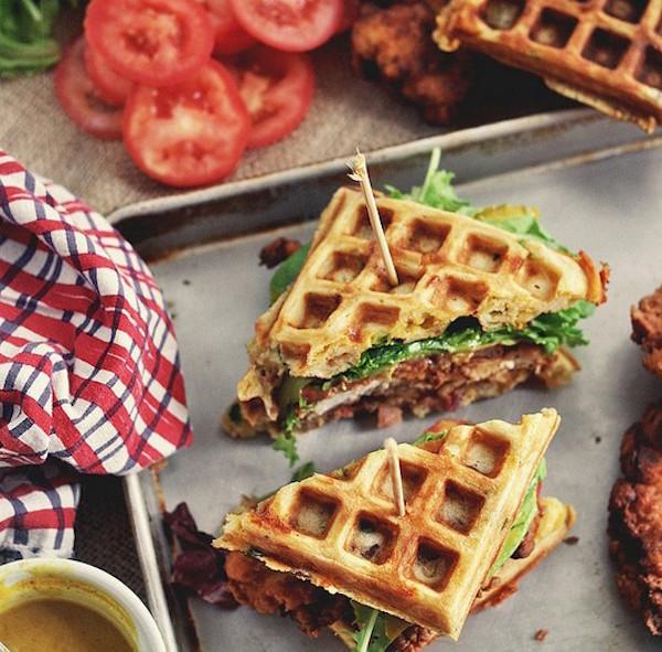 25 有培根、干酪、洋葱的鸡肉松饼三明治