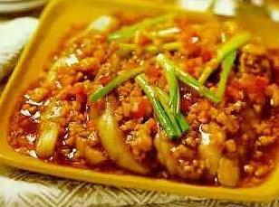 原料:肉泥20克、茄子200克、香葱10克、生姜10克。