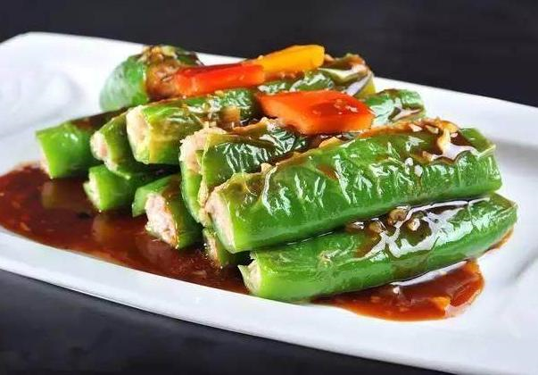 1.选用7厘米长的青椒24只,用剪刀通开,去尽子,椒内撒干淀粉。[美食中国]