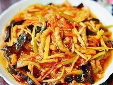 食材:猪瘦肉、冬笋、黑木耳、胡萝卜、葱、蒜、姜、自制剁椒、肉汤、盐、糖、醋、生抽、淀粉