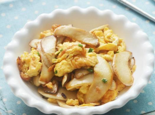 6、直至杏鲍菇断生,且双面都金黄的时分,下入鸡蛋,炒匀。