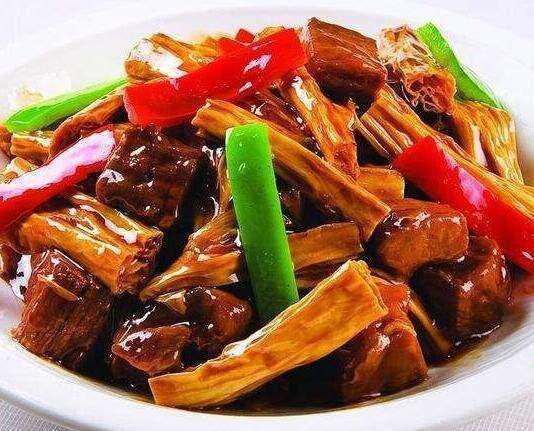 材料:腐竹、茶树菇、入郫县豆瓣酱、十三香、盐、糖、酱油、老抽、冰糖