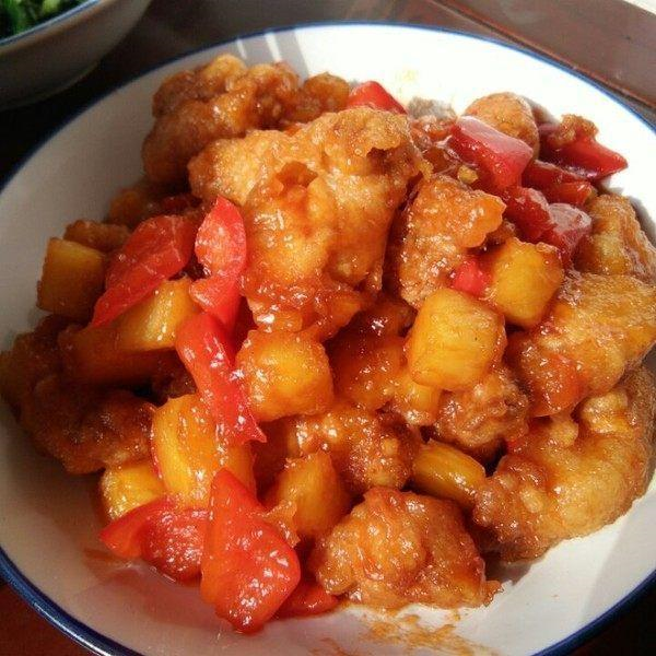 菠萝咕噜肉:梅肉切成块,用刀切成片排片;料酒,鸡蛋,淀粉少许,食用油抓匀腌10分钟;菠萝切片;红辣椒切成块的大小;腌制肉类用手指裹成一个球,均匀的干淀粉型50%、热锅煎黄的鱼;锅加热到80%左右,复炸成硬,除去油;用小碗拌番茄酱、酱油、糖和适量的水放入酱油、辣油,倒入酱油煮至浓稠,加入肉丸菠萝,红辣椒炒。