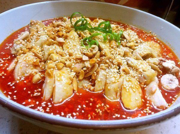 辣椒酱清蒸鸡:全鸡干净,冷水下锅煮,加姜葱,撇去浮沫,文火煮10分钟,熄火后约10分钟;准备一盆冷水,取出鸡炖泡冰水,突然降温,可使皮肤紧绷,吃脆的;将鸡肉完全冷却干燥,一层芝麻油对铸件的表面;蒜酱放入碗里兑匀所有项目;拍黄瓜平底,切碎的鸡肉菜片;倒入酱油,撒上花生碎和香菜;冷藏半小时多吃沙爹!