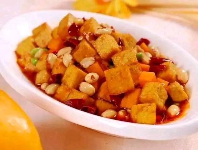 1、花生米油炸熟备用;豆腐汆烫后切小丁,锅中放油烧热,下豆腐丁炸至金黄色捞出沥油备用