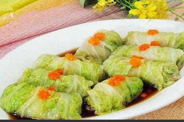 3.将白菜摊开,上放调好的豆粉茸卷裹成卷,上笼蒸约5至10分钟。