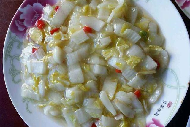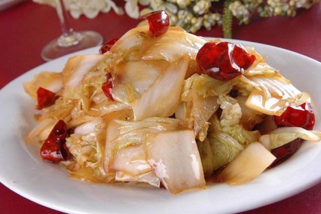 原料:大白菜300克,精盐,白糖,白醋,干辣椒,生姜,花椒,花生油。