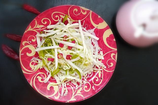 3.白菜、皮蛋、香菜、辣椒油、葱蒜末、盐拌匀。出锅放油烧到冒烟,滋拉一下倒在白菜上面,拌开即可。