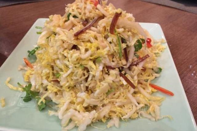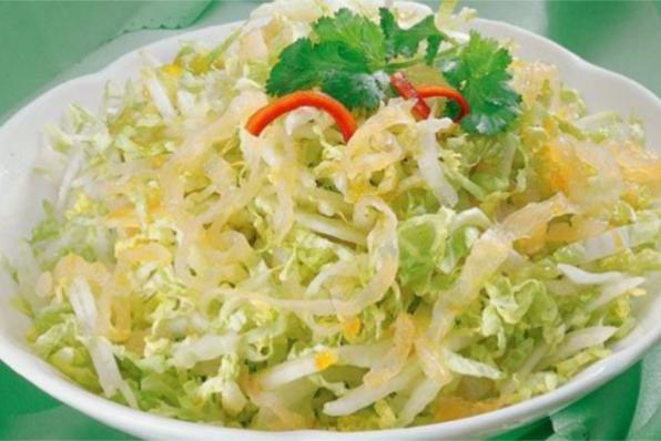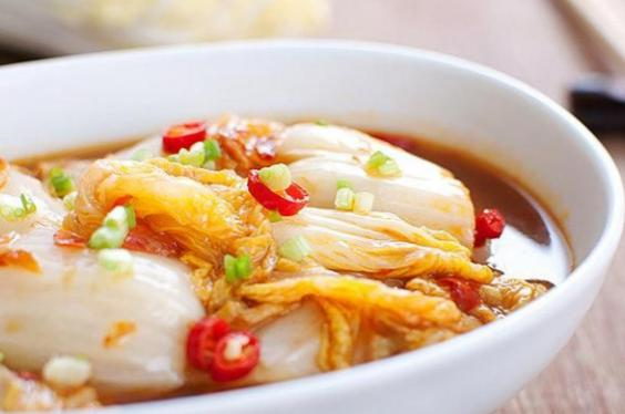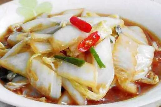 原料:大白菜500克,香油10克,精盐4克,白糖40克, 醋15克,干辣椒5克,葱8克,姜5克。