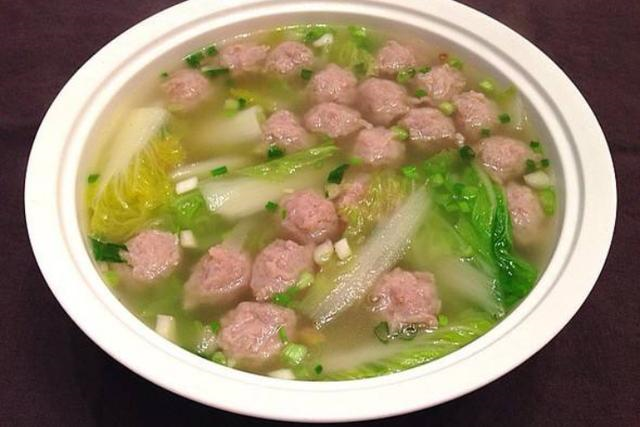 3.将白菜放入水中煮,加少许盐和胡椒粉调味,白菜煮2分钟后加入肉丸再煮1分钟左右就可出锅了,撒上点葱花。