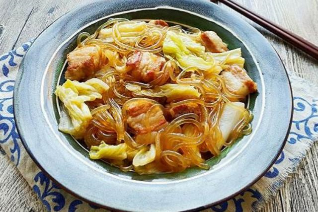 2.白菜下锅,翻炒片刻,加水、粉条、豆腐,盖锅盖,中小火焖15-20分钟。