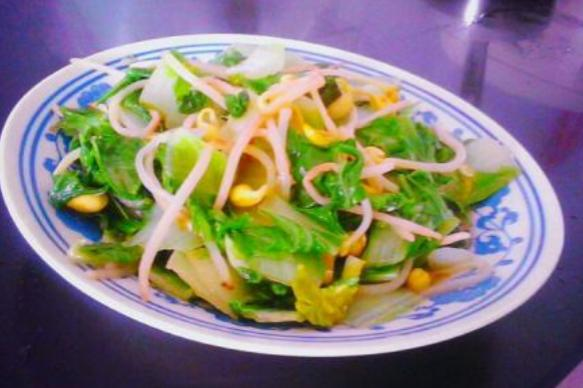 原料:白菜200克,黄豆芽200克,酱油5克,盐3克,姜5克,植物油20克。