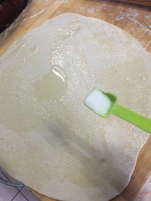 接着就是把烙饼的锅准备好、把其中一个面团用擀面杖擀成圆形、不能太厚也不能太薄、倒入一点食用油、和一勺盐抹均匀