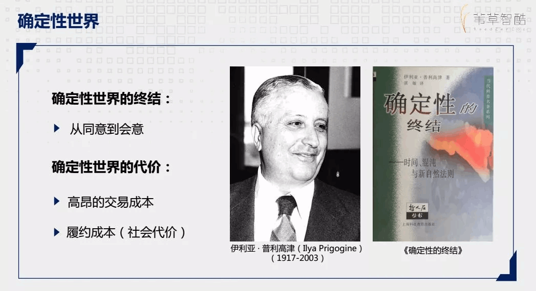 普利高津有一本书《确定性的终结》讲到确定性世界的终结,确定性世界的代价有:高昂的交易成本、履约成本、多次重复博弈。
