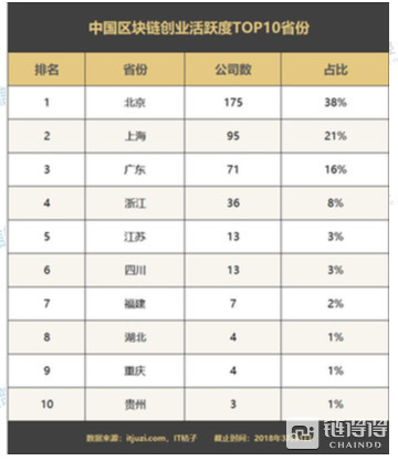从中国区块链公司的地域分布状况来看,北京、上海、广东、浙 江依然是区块链创业的集中地,四地合计占比超 80%。其中,北京以 175 家公司、占比 38%处于绝对的领先地位;上海以 95 家公司,占比 21%位居第二;广东省以 71 家公司、占比 16%位居第三;浙江省以 36 家公司、占比 8%位居第四。除此以外,中国区块链创业活跃度前十名的省份还包括江苏、四川、福建、湖北、重庆、贵州。