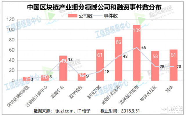 从产业链结构上,目前我国区块链产业链条已经形成,从上游的硬件制造、平台服务、安全服务,到下游的产业技术应用服务, 到保障产业发展的行业投融资、媒体、人才服务,各领域的公司已经 基本完备,协同有序,共同推动产业不断前行。截至 2018 年 3 月底,区块链领域的行业应用类公司数量最多,其中为金融行业应用 服务的公司数量达到 86 家,为实体经济应用服务公司数量达到 109 家。此外,区块链解决方案、底层平台、区块链媒体及社区领域的相关公司数量均在 40 家以上。